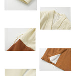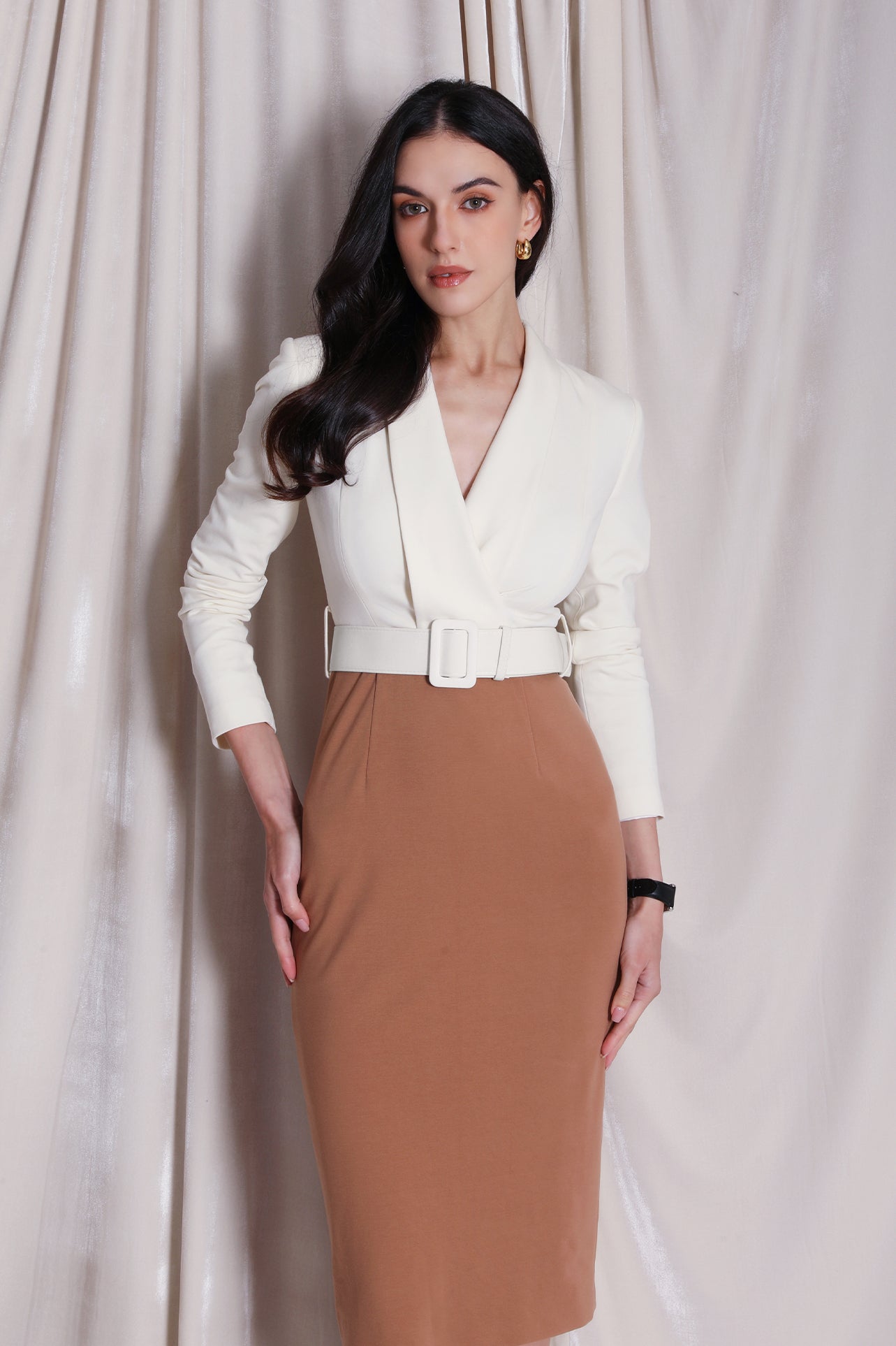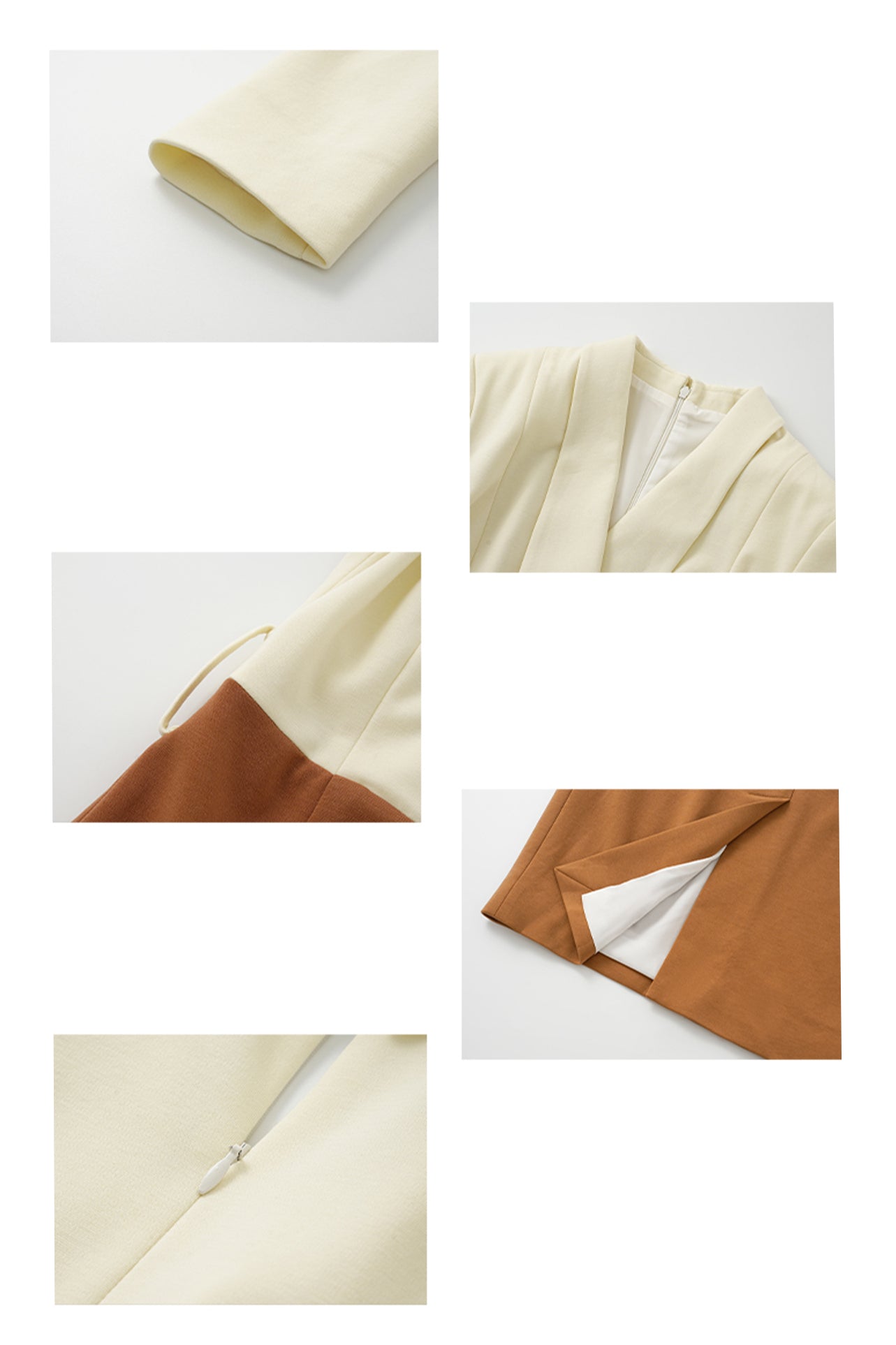 This color-block shawl collar dress exudes the sophistication of a leading lady in American television dramas.