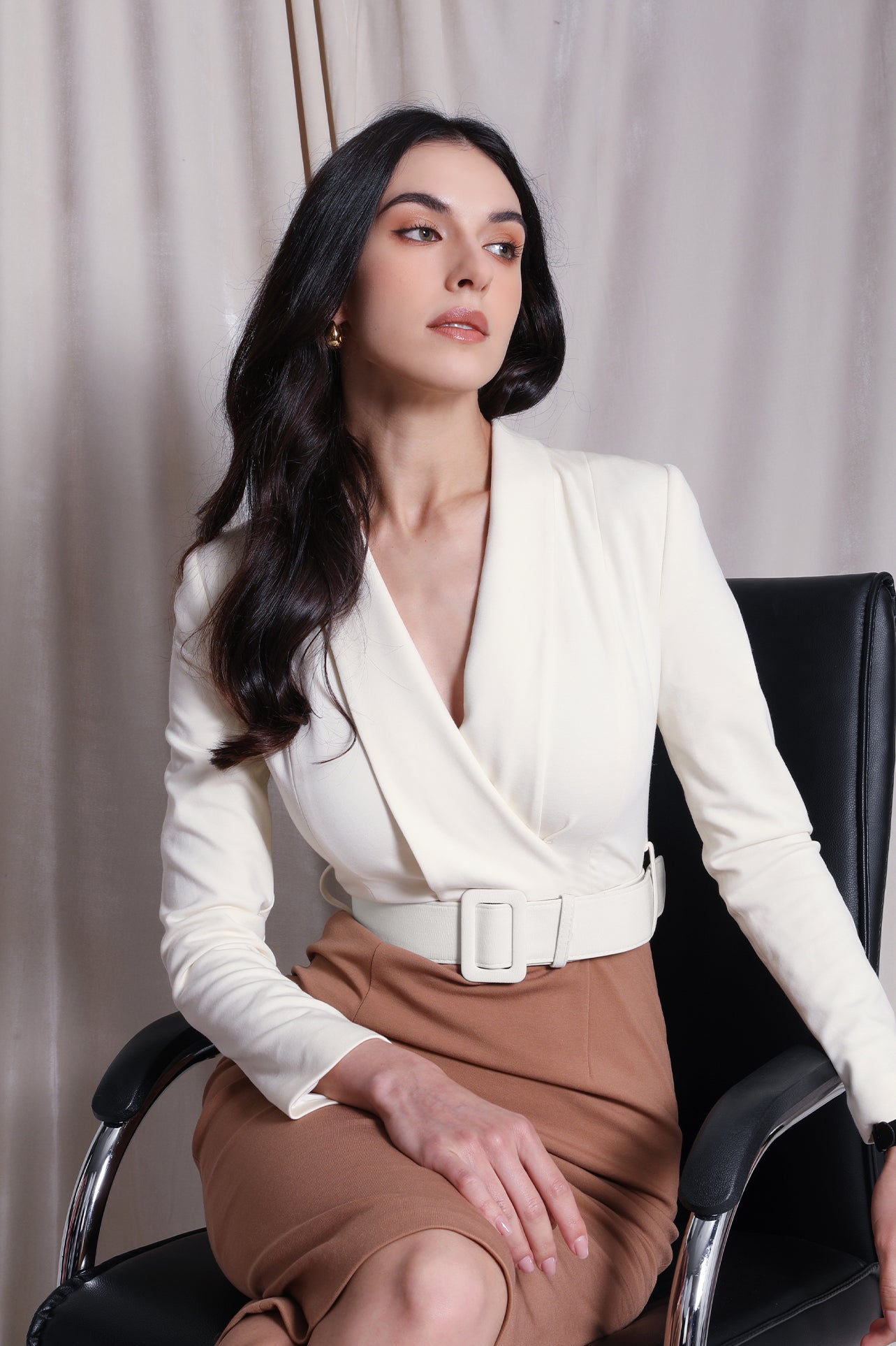 The creative yet wearable off-white and coffee color-block combination instantly catches the eye.