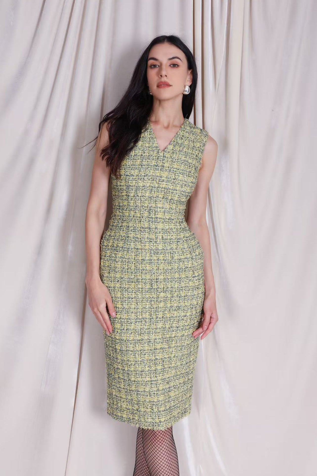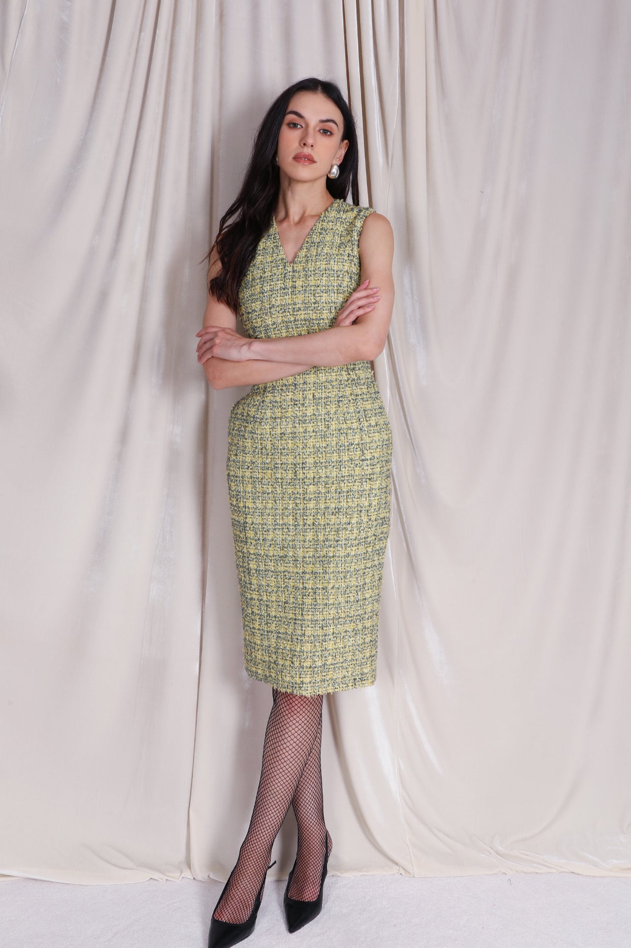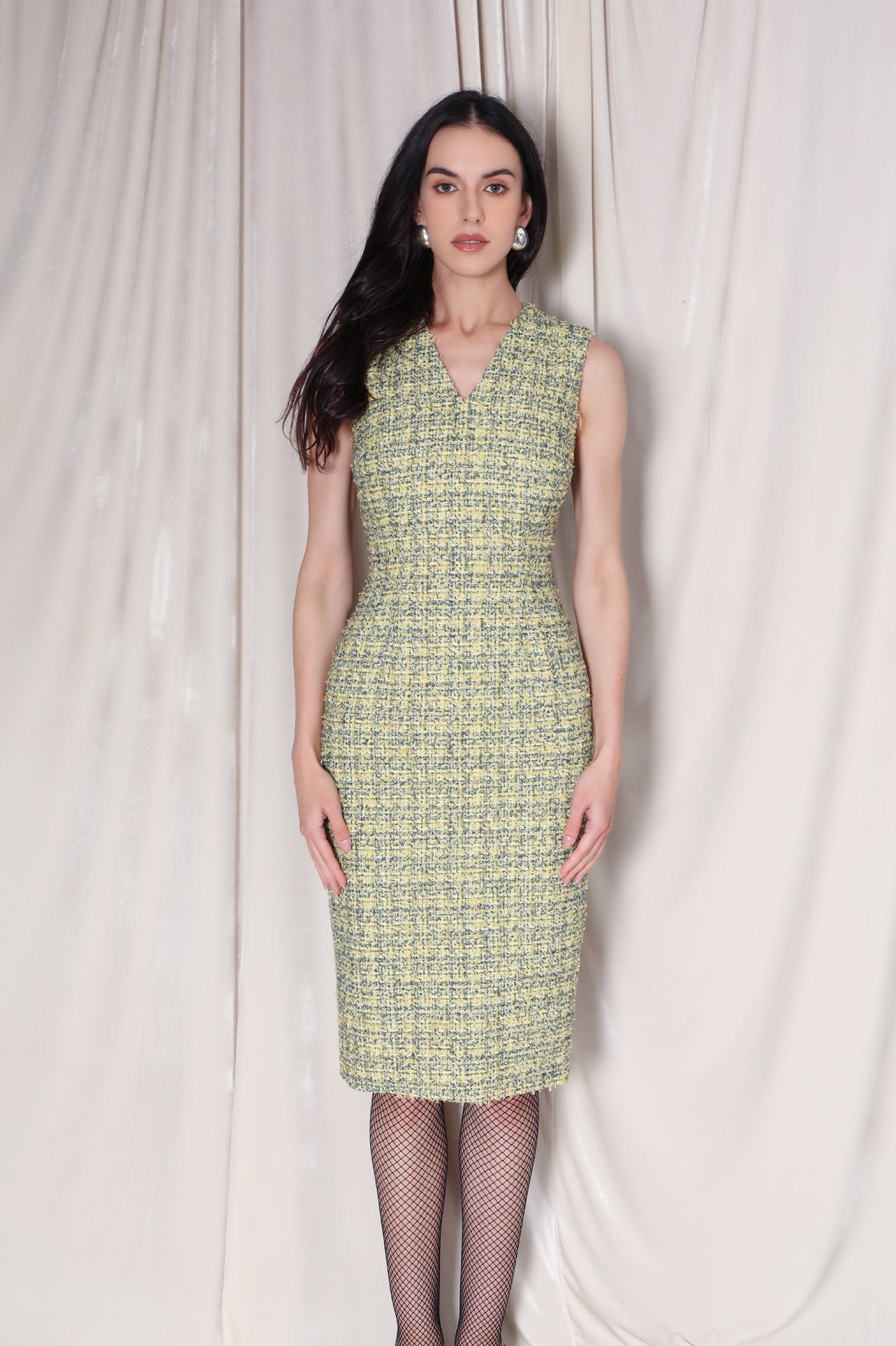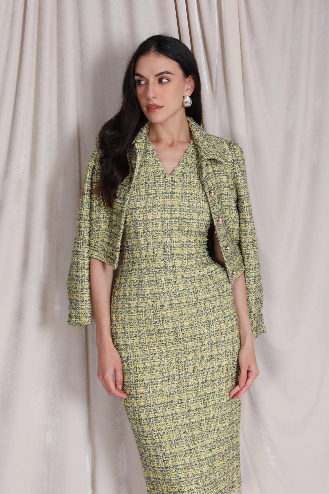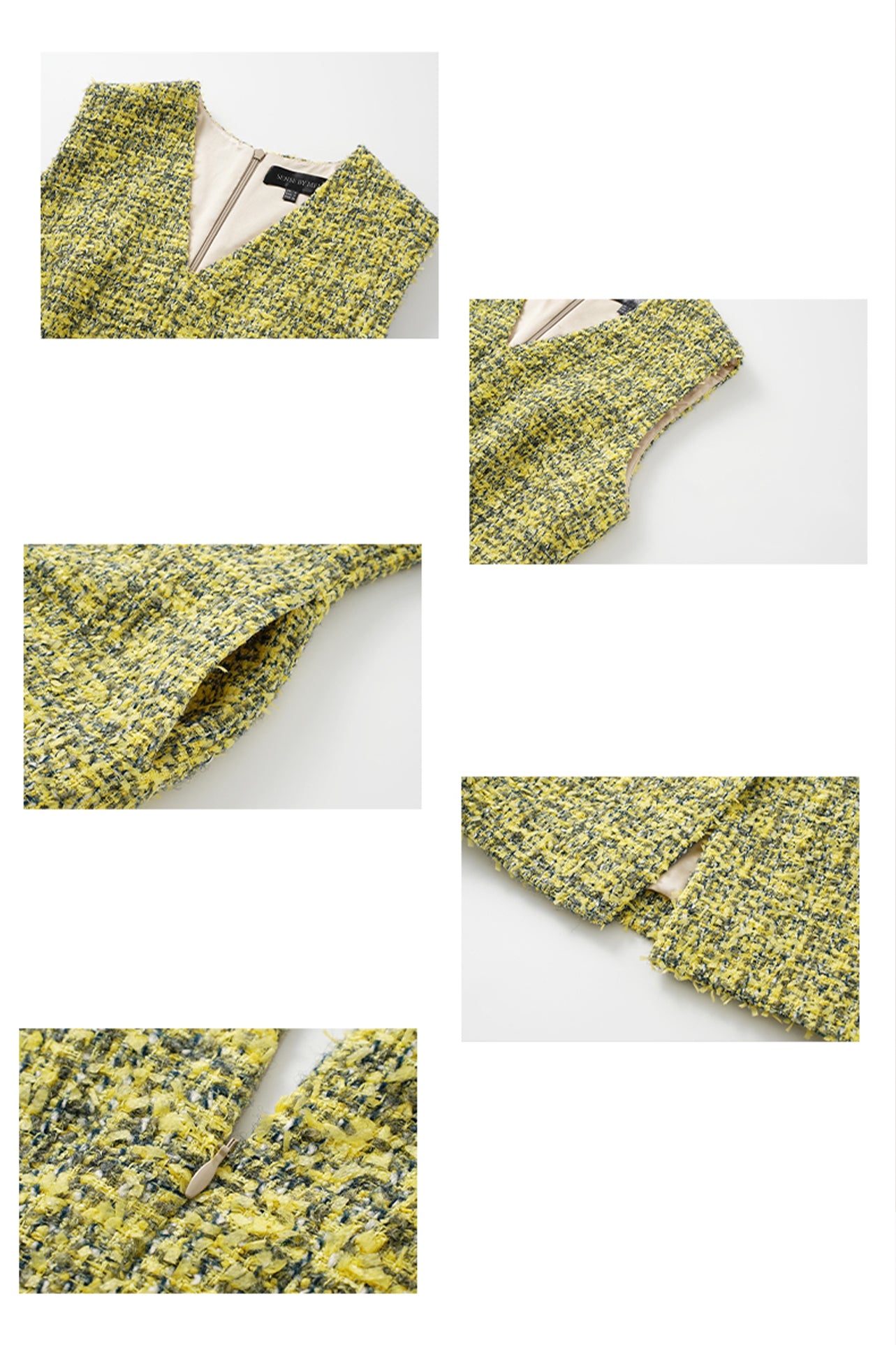 Crafted from yellow tweed fabric that exudes seasonal warmth and texture.