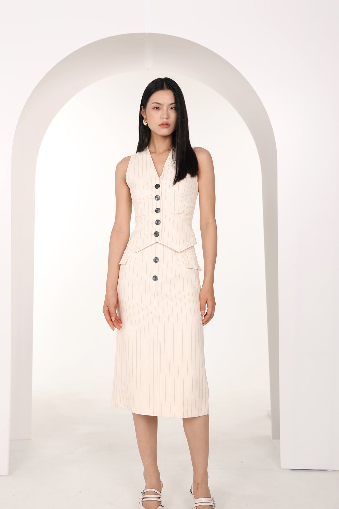 A professional woman wearing a sophisticated off-white pinstripe vest top, featuring a slim-fit tailored silhouette, classic V-neck, and contrasting black buttons for a modern business casual look.