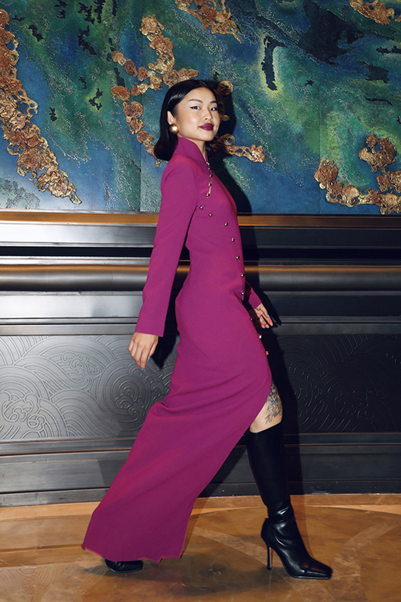 L'abito qipao BYMEI rosa-viola fonde l'eleganza tradizionale con un tocco moderno. La sua tonalità rosa-viola e i bottoni dorati aggiungono un tocco di vitalità contemporanea, mentre la spalla strutturata e il colletto drammatico traggono ispirazione dal classico cinema di Hong Kong.