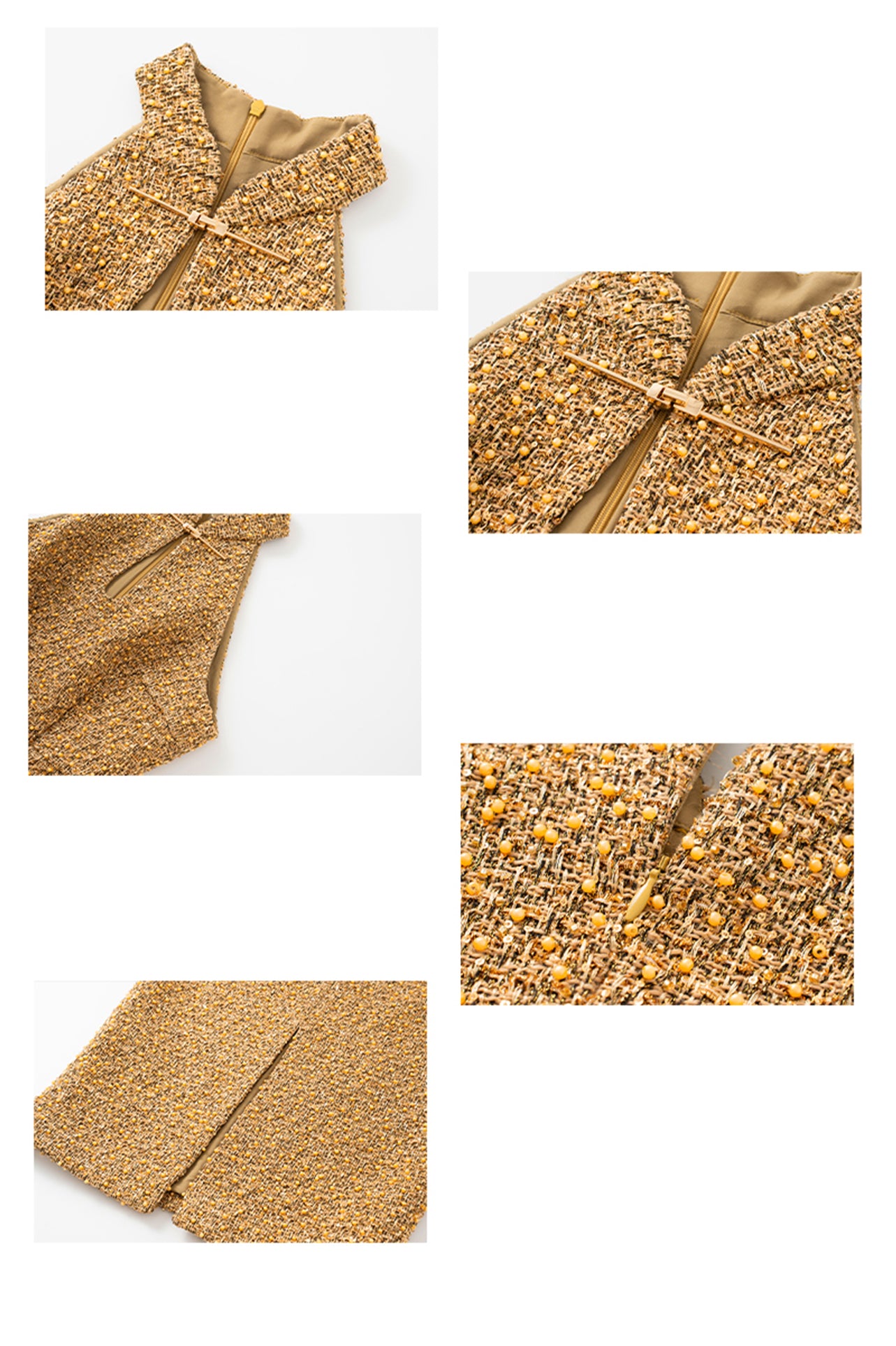 This gold embroidered beaded sleeveless knee-length Qipao is exquisitely tailored.