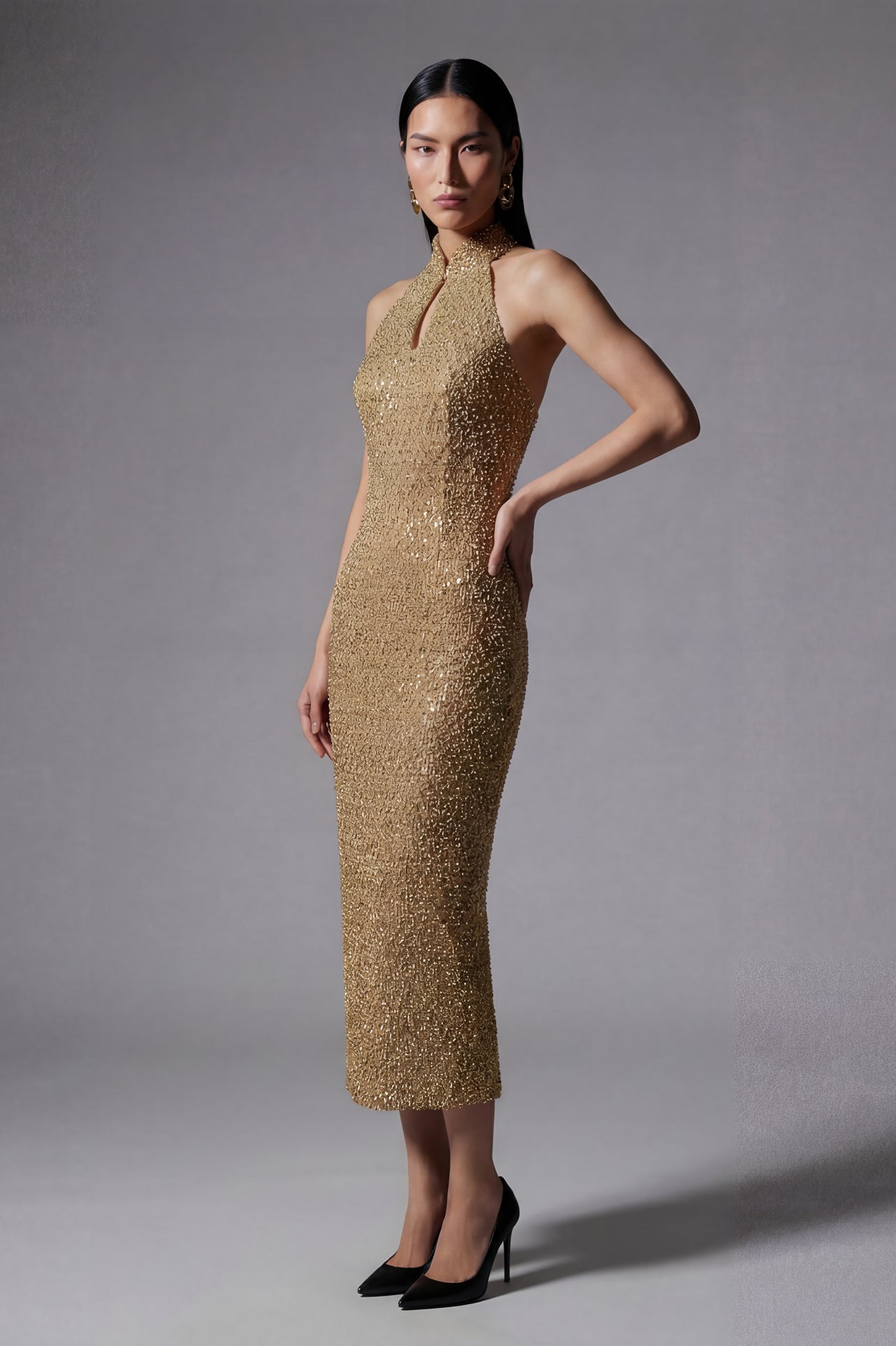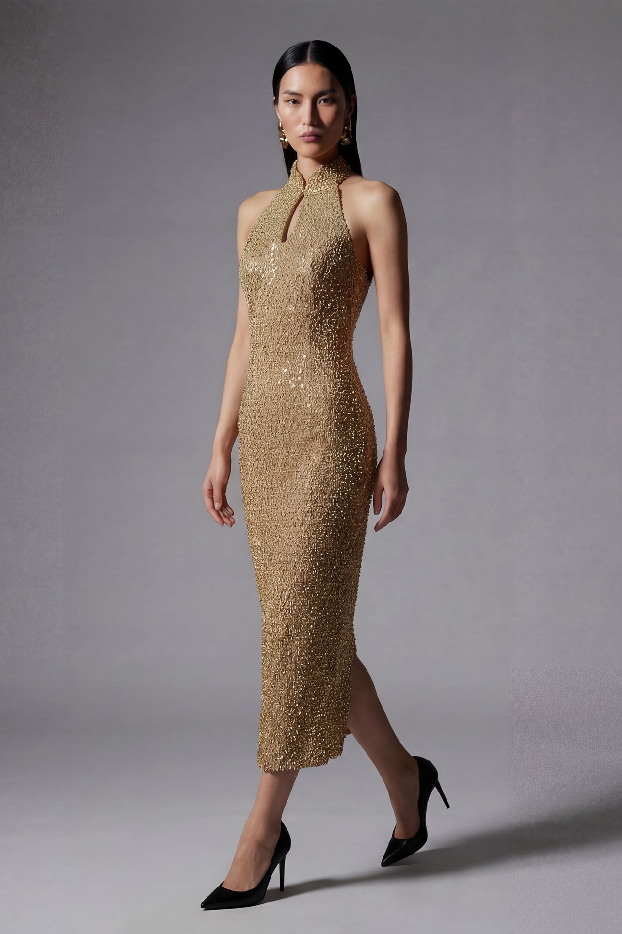A stunning professional model wearing a luxurious gold sequined halter neck evening gown, featuring a sophisticated keyhole neckline and a slim-fit silhouette for a formal gala look.