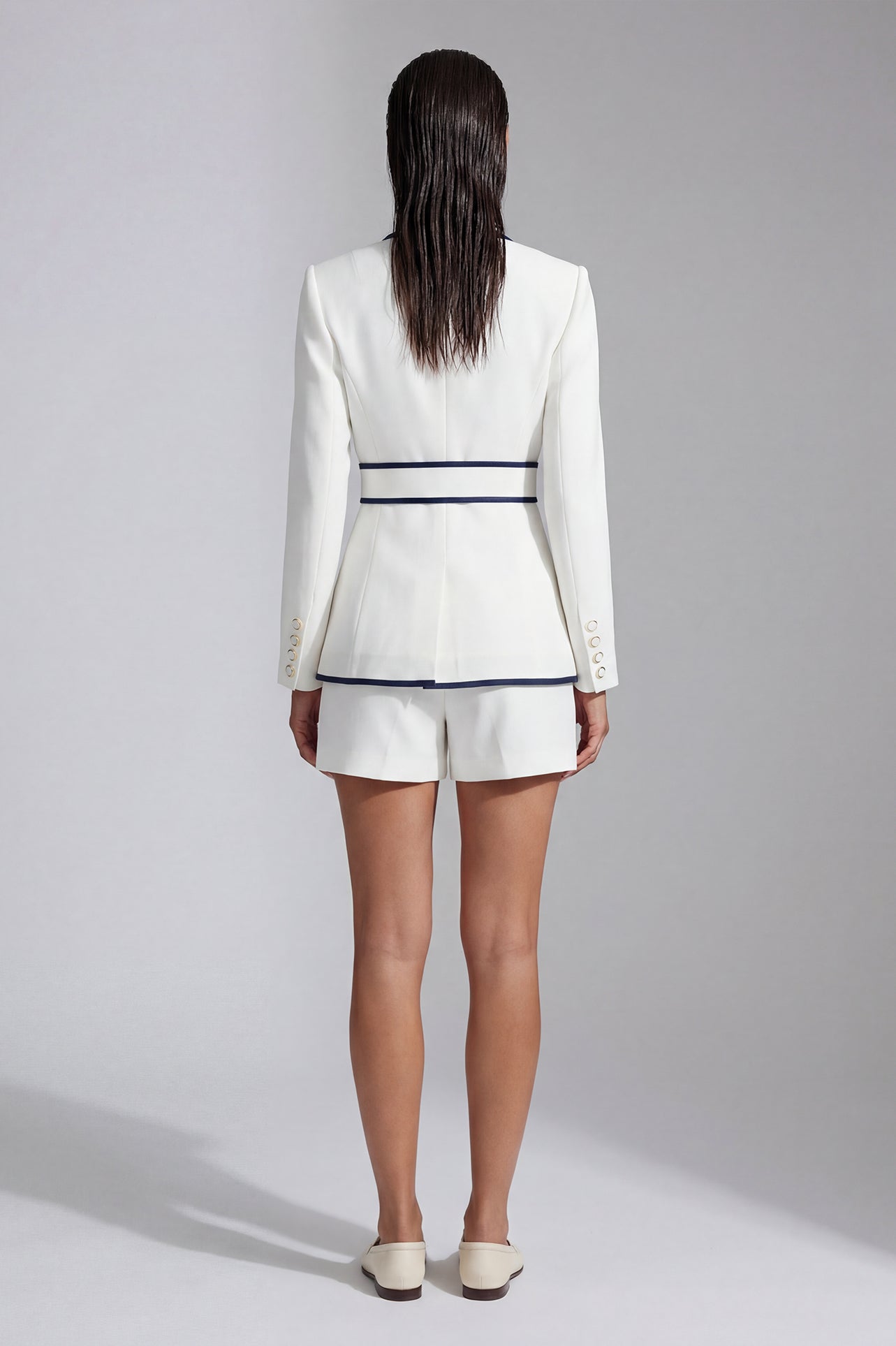An elegant professional woman wearing a tailored white blazer with navy blue contrast piping, featuring a self-tie belt to define the waist for a smart-casual office look