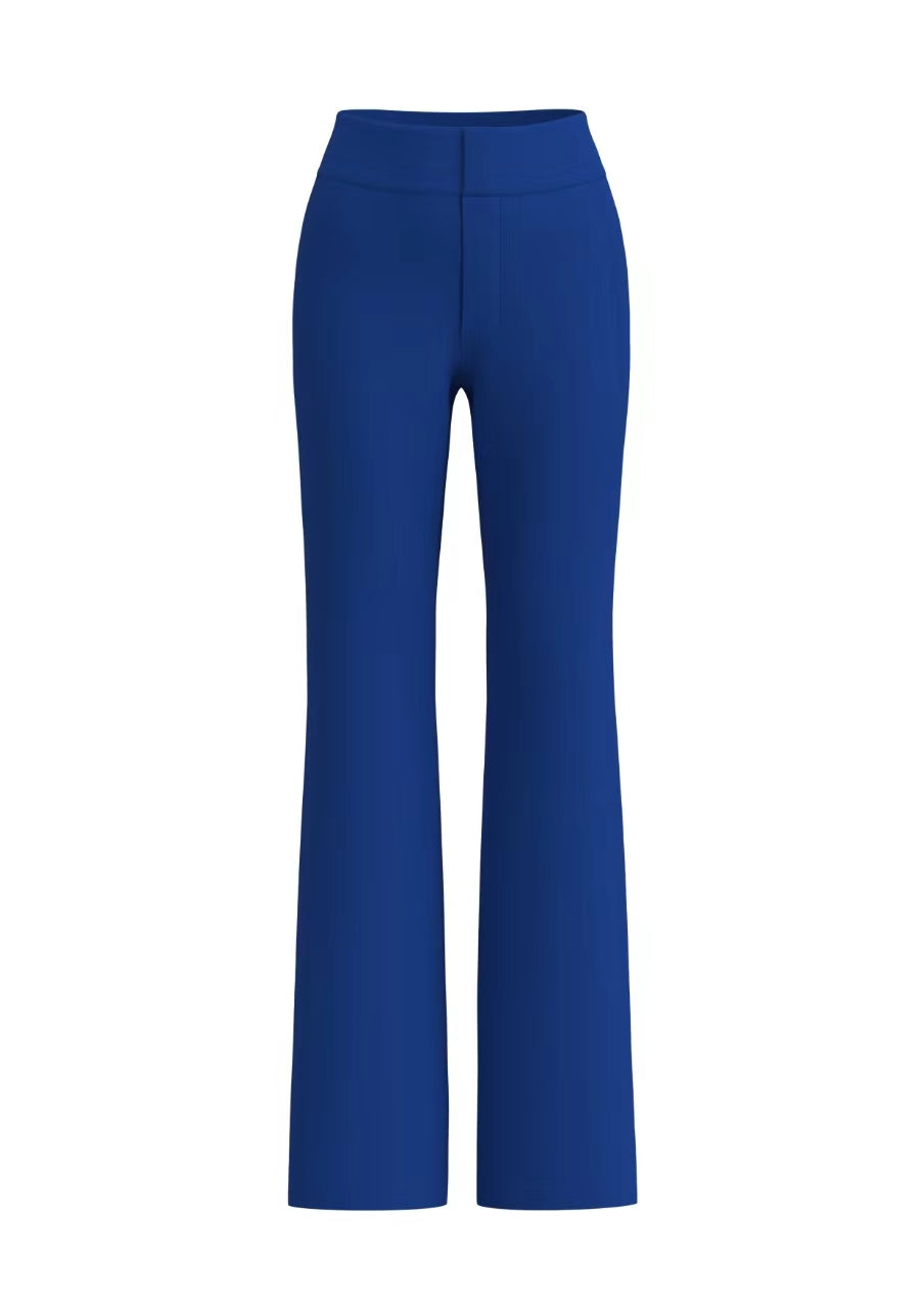 A professional woman wearing sophisticated royal blue high-waisted wide-leg trousers, featuring a tailored loose-fit silhouette for a modern and vibrant executive office look.