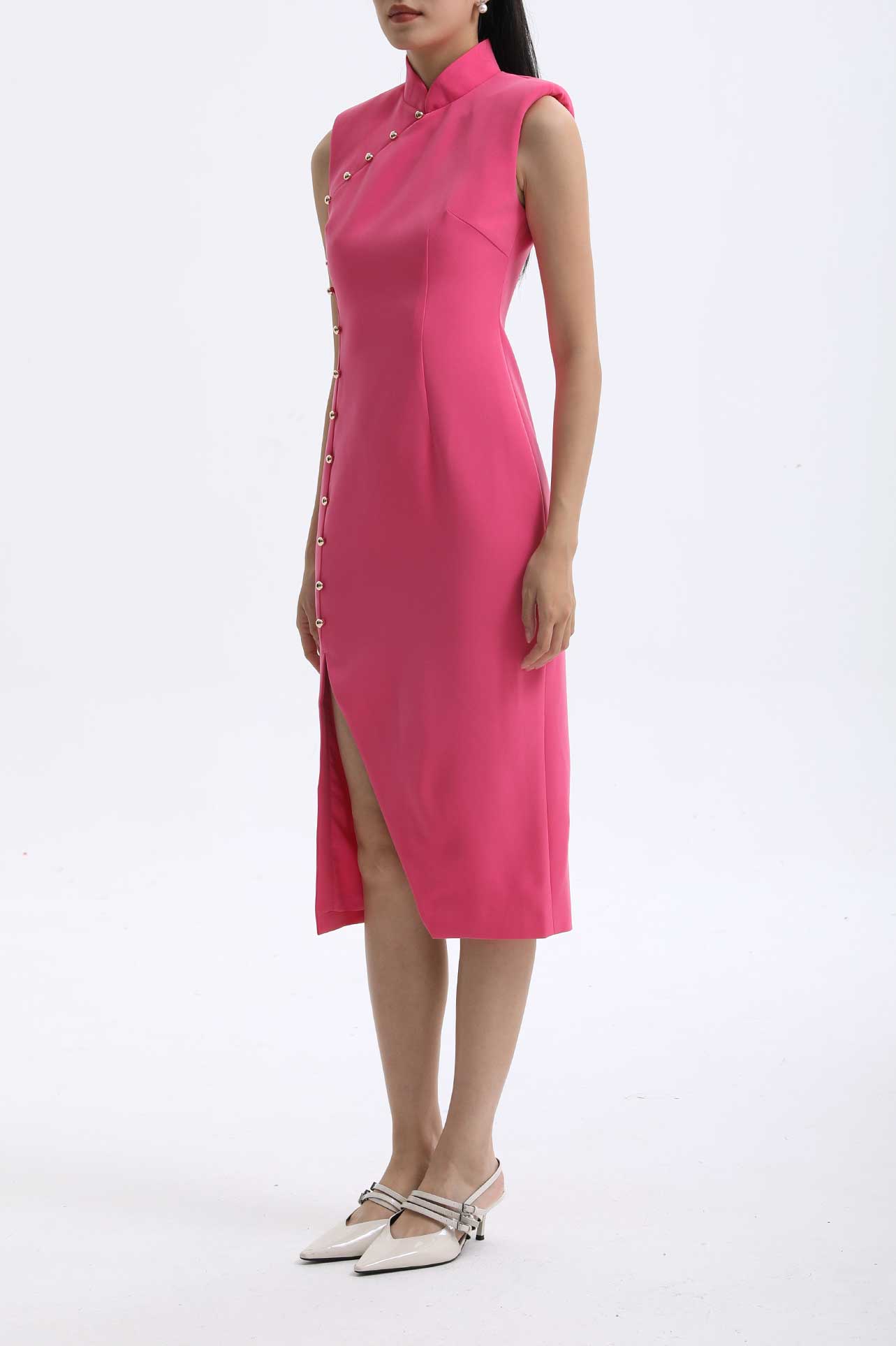 A professional woman wearing a vibrant hot pink modern qipao dress, featuring a classic mandarin collar, sleeveless design, and elegant gold button side-fastening with a sophisticated slit for an oriental chic look.