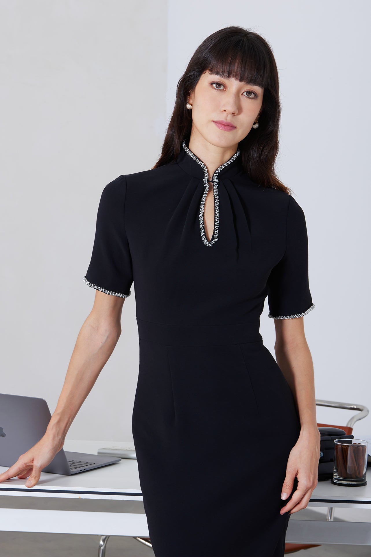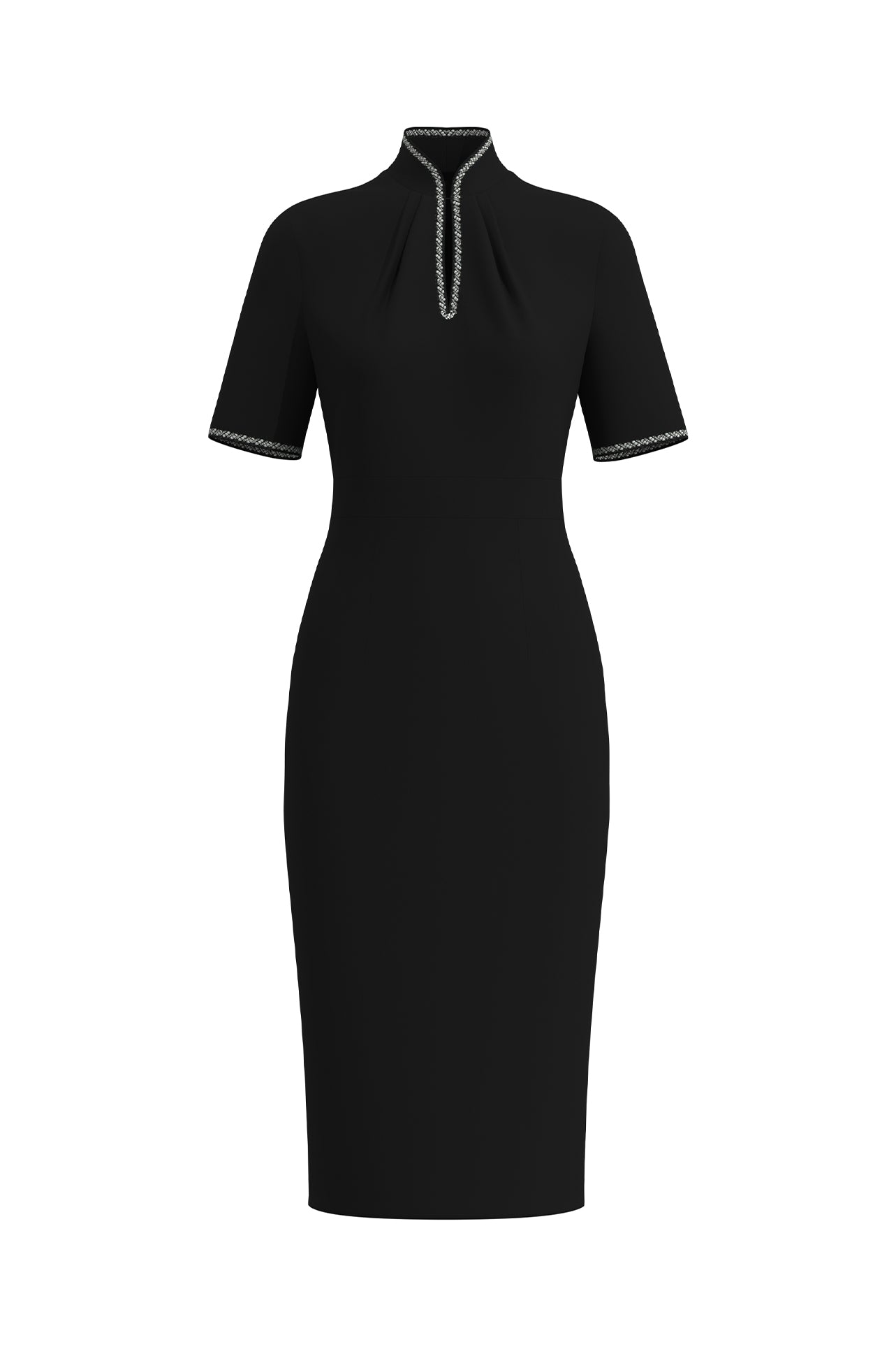 An elegant woman wearing a sophisticated black short-sleeve sheath dress, featuring a traditional mandarin collar with a modern keyhole neckline and delicate beaded trim details for a polished formal look.
