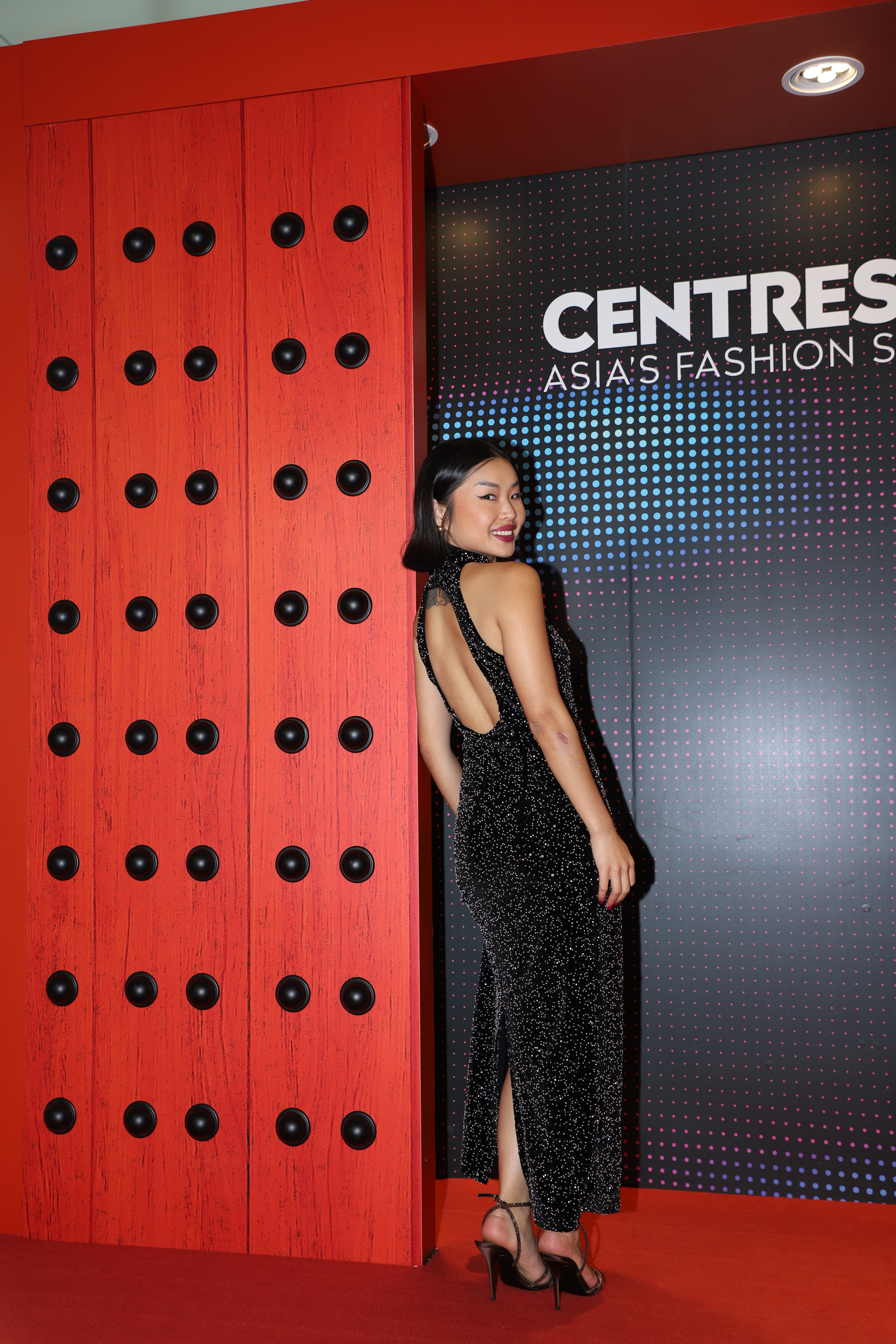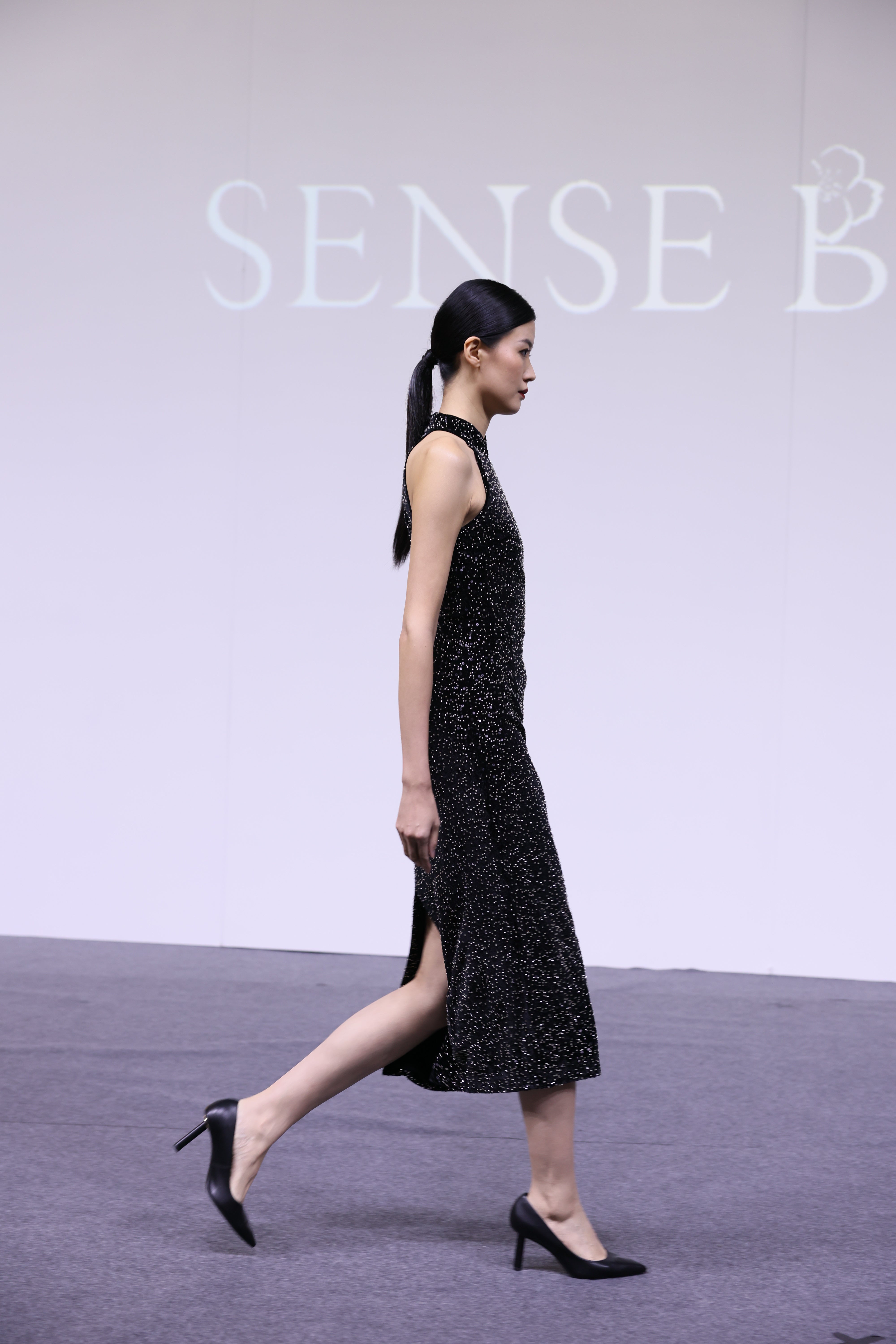 A stunning woman wearing a sophisticated black sequin halter midi dress, featuring a traditional mandarin collar and a shimmering bodycon silhouette, perfect for a modern oriental-inspired evening party look.