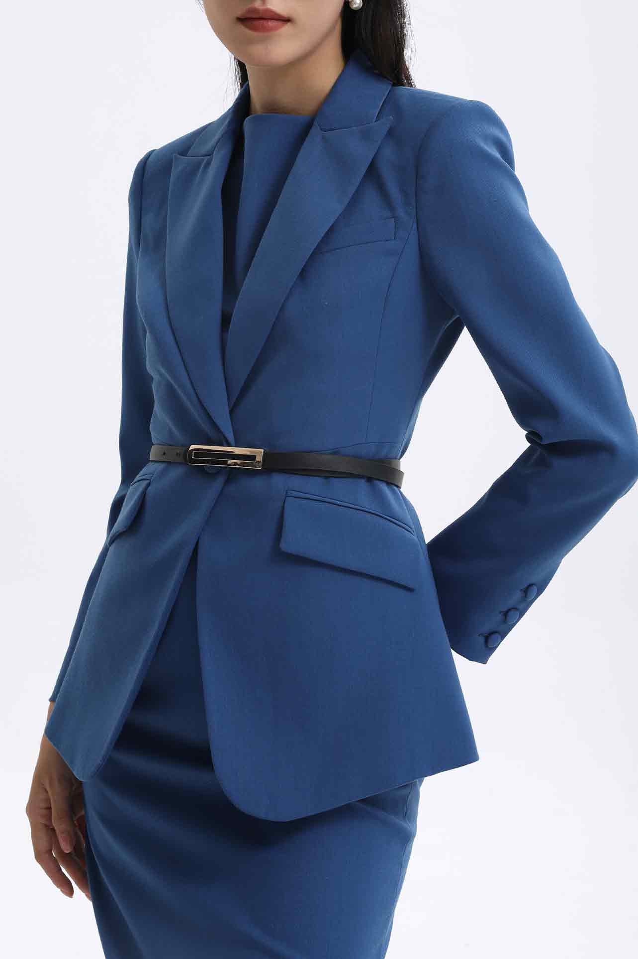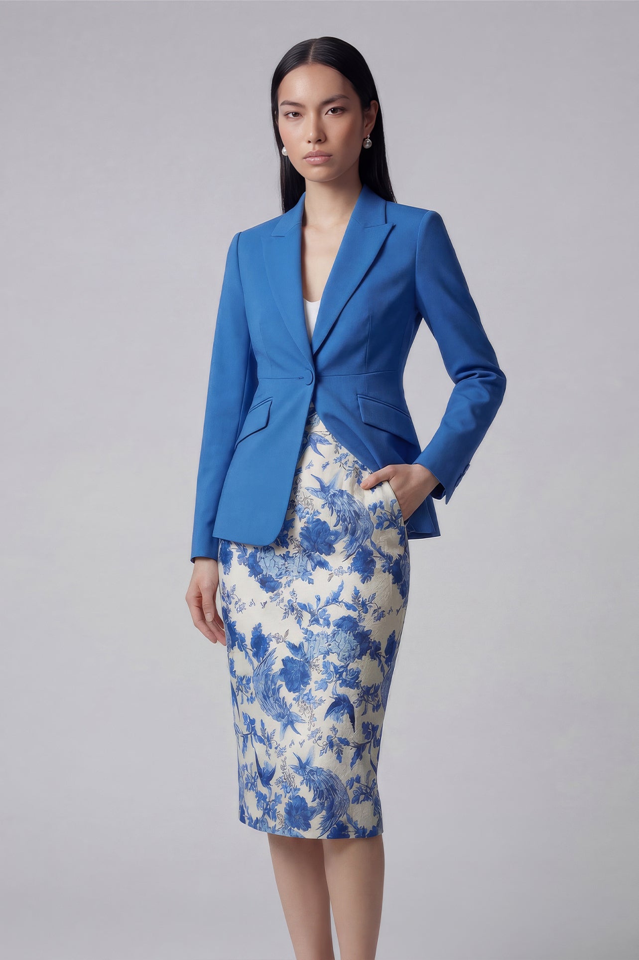 A professional woman wearing a sophisticated royal blue tailored skirt suit, featuring a slim-fit single-button blazer with structured shoulders and a matching midi pencil skirt for a powerful executive office look.