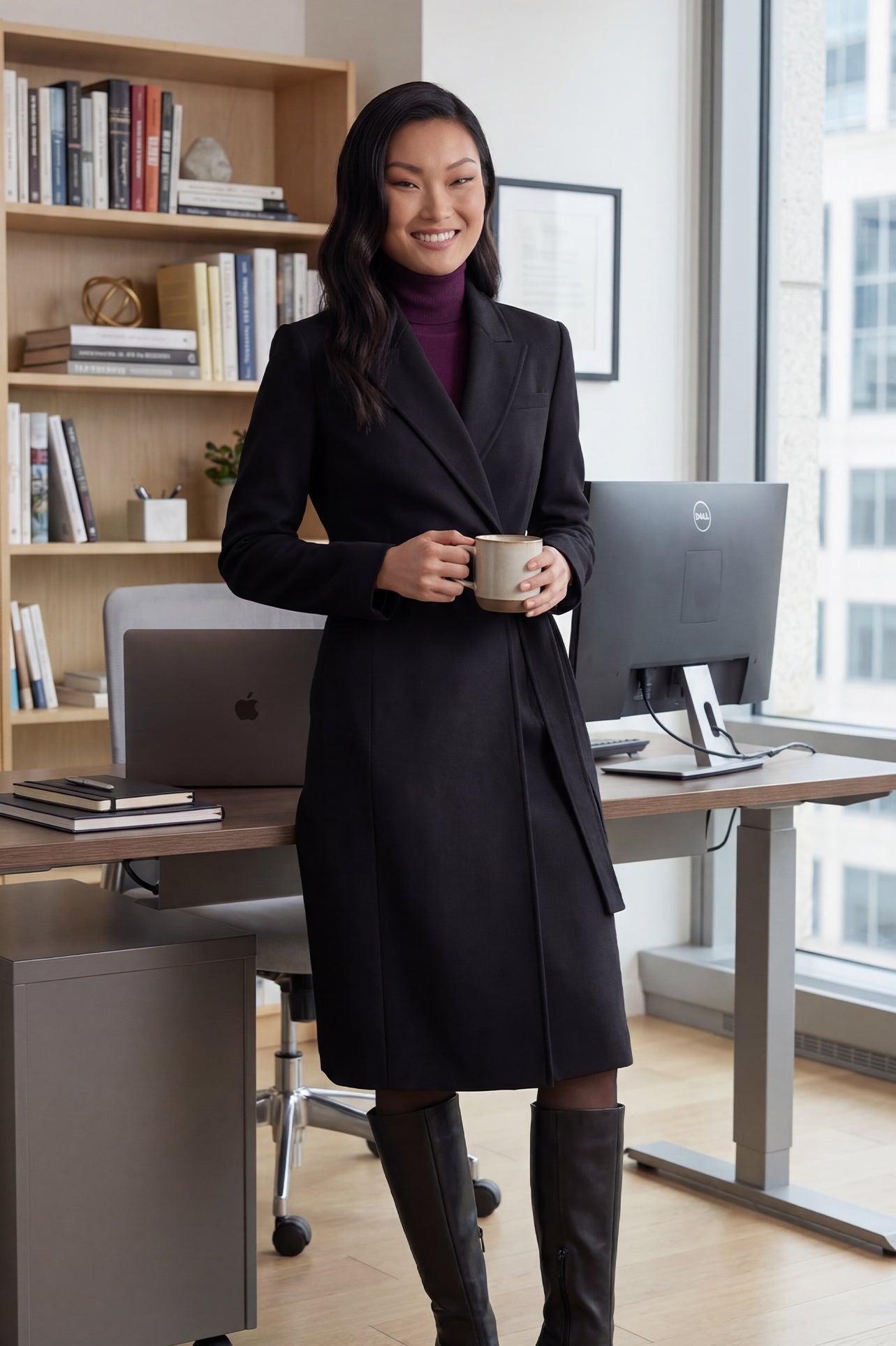 A professional woman wearing a sophisticated black long-sleeve coat dress, featuring an elegant tie-waist belt and notched lapels, styled over a white shirt for a polished executive business look.