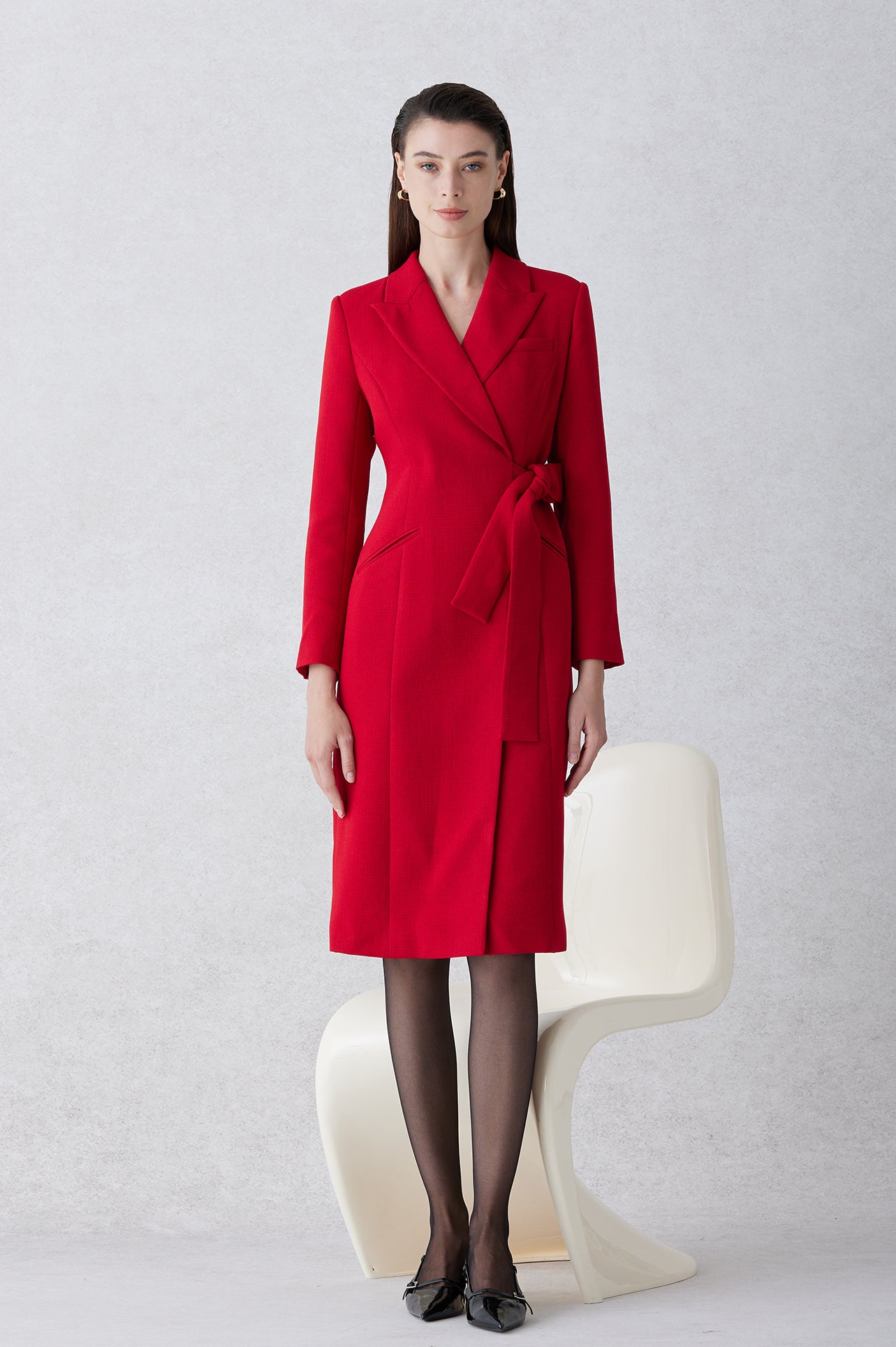 A sophisticated woman walking in London wearing an elegant vibrant red wrap coat dress, featuring a tie-waist belt and notched lapels for a polished executive street style look.