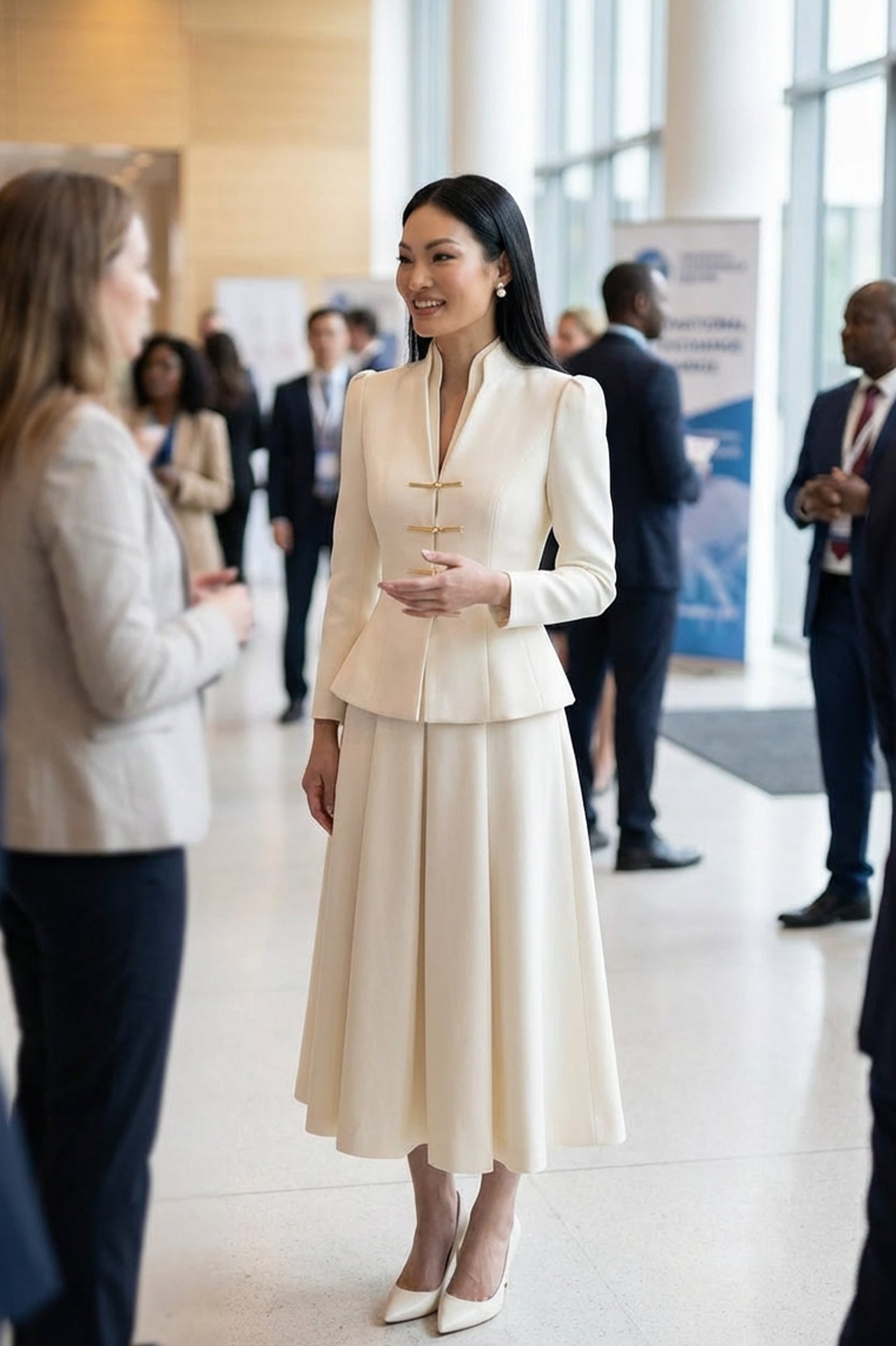 A sophisticated woman enjoying coffee in Paris wearing an elegant cream white modern qipao suit, featuring a mandarin collar blazer with traditional frog buttons and a matching pleated skirt for a quiet luxury oriental look.