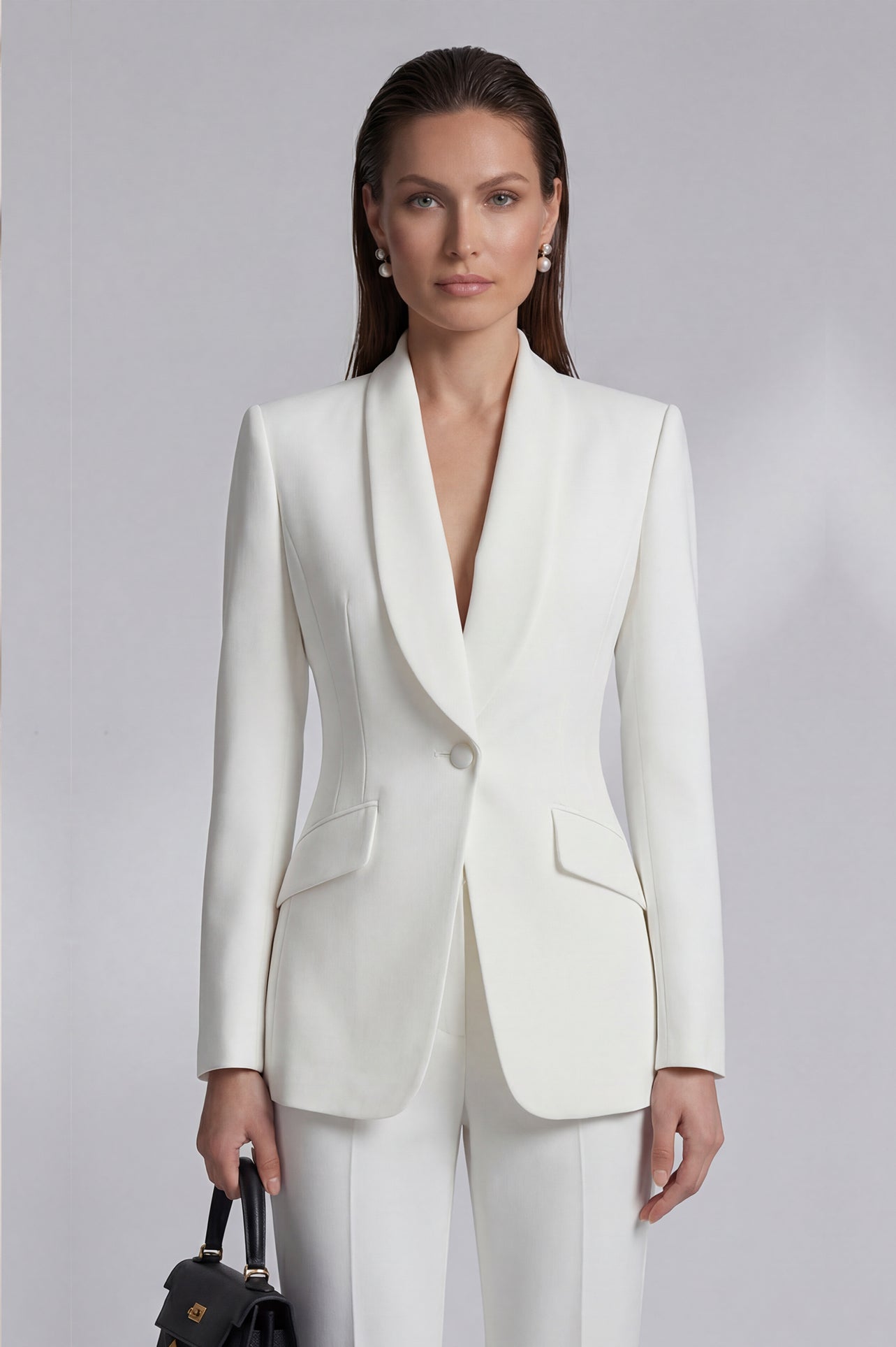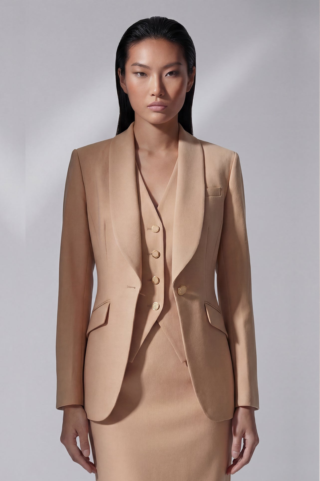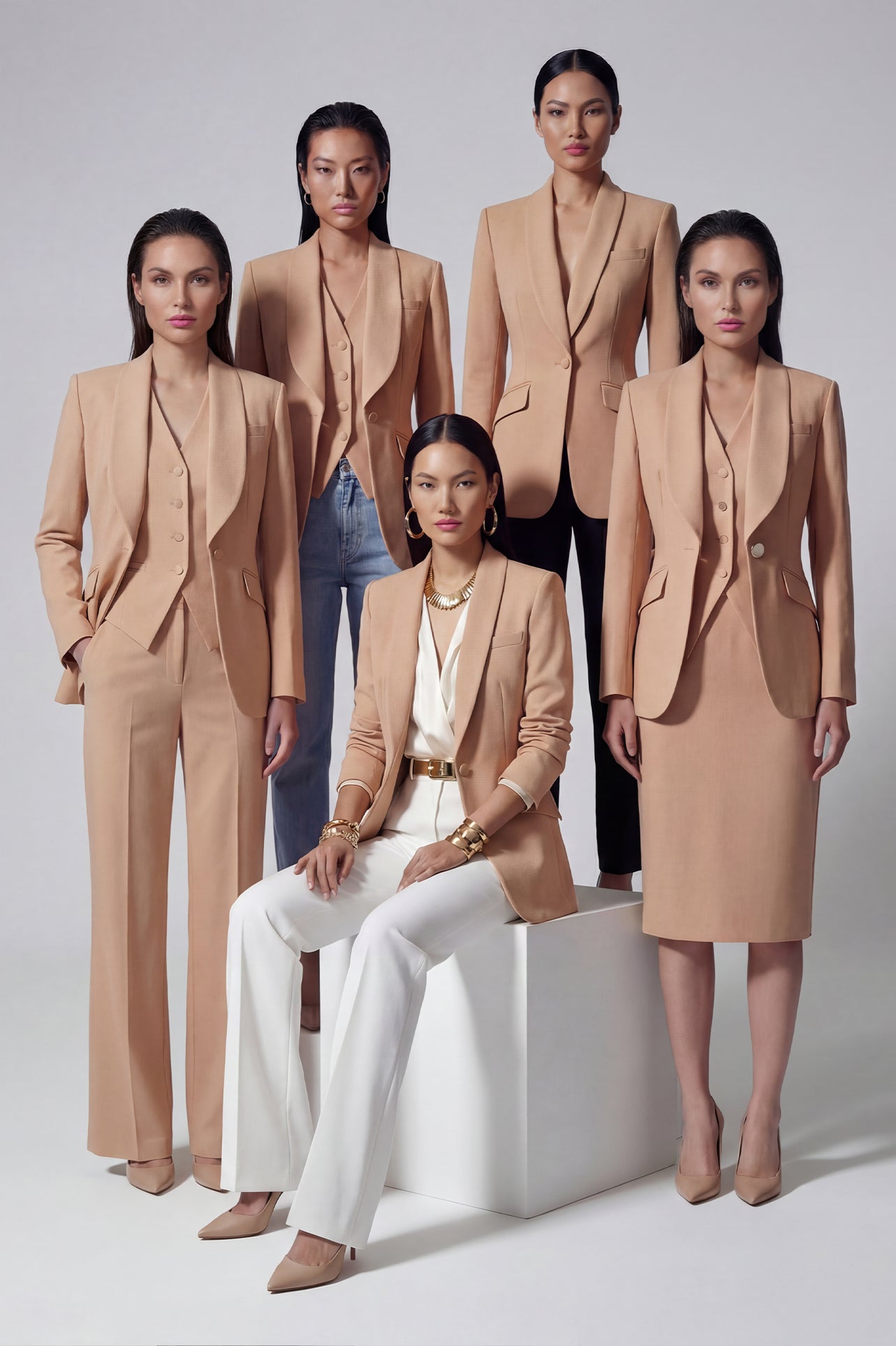Two professional women showcasing high-end executive business suits: one in a crisp white pant suit with a shawl lapel blazers, and the other in a sophisticated camel skirt suit with a tailored vest, perfect for formal corporate settings.