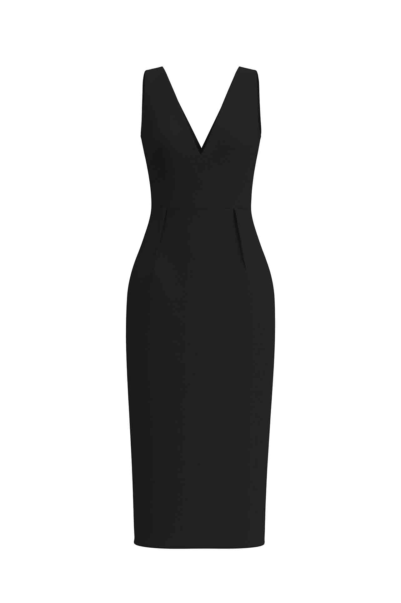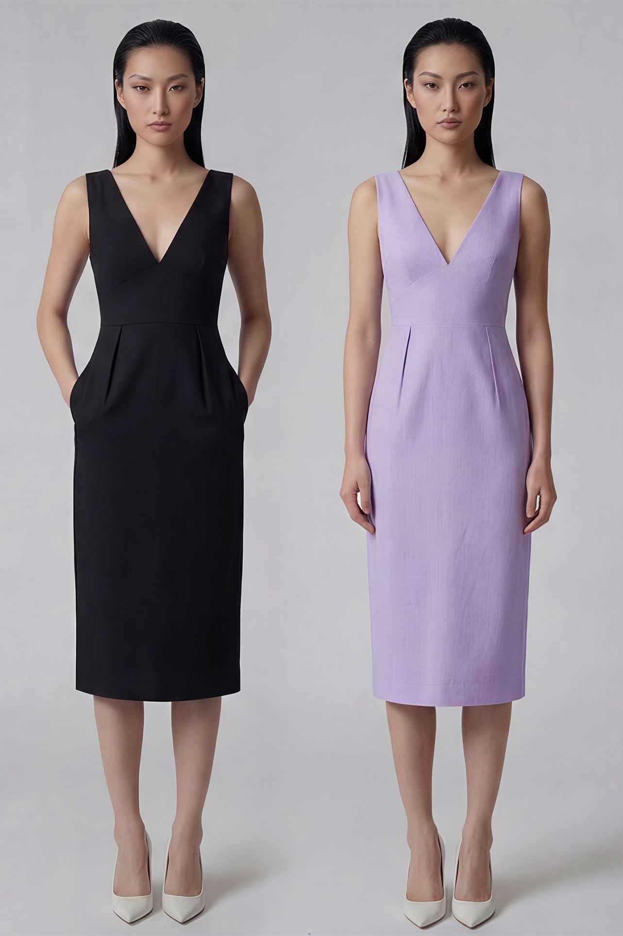 A professional woman showcasing two elegant sleeveless V-neck sheath dresses in classic black and soft lilac purple, featuring functional side pockets and a tailored fit for a polished office look.