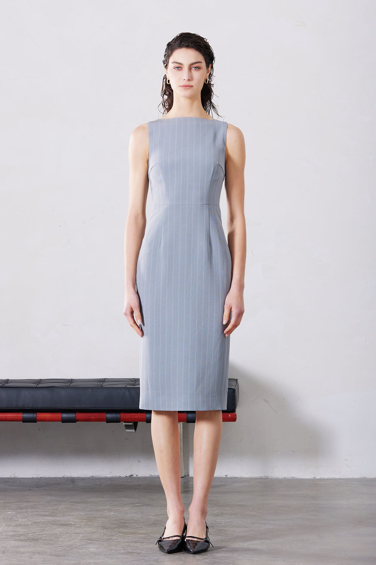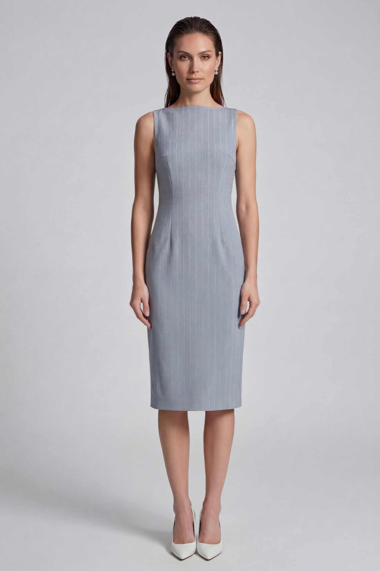 A professional woman wearing a sophisticated light grey pinstripe sleeveless sheath dress, featuring an elegant boat neckline and a tailored slim-fit silhouette for a polished executive look.