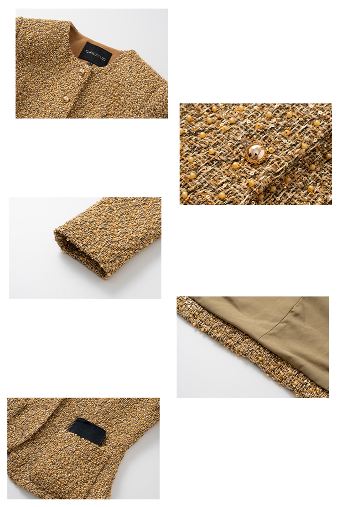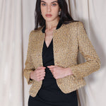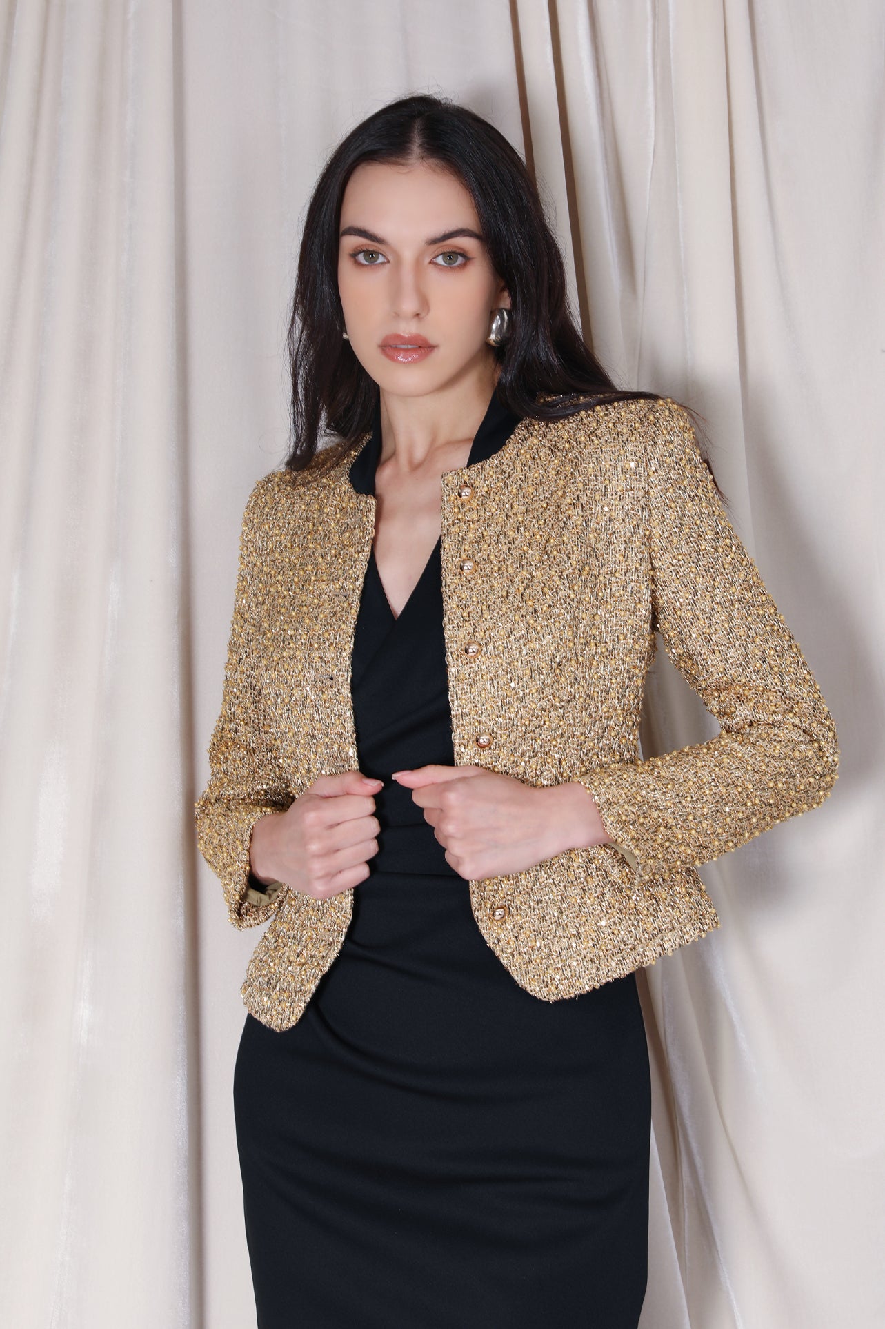This classic Chanel-style cardigan jacket features a timeless silhouette. Meticulously hand-beaded for a dazzling effect, it is accented with rose gold buttons that complement the golden base. Pair it with neutral tones for an effortlessly captivating look.